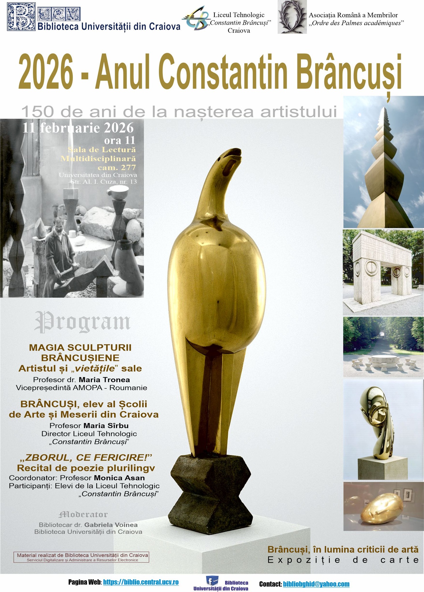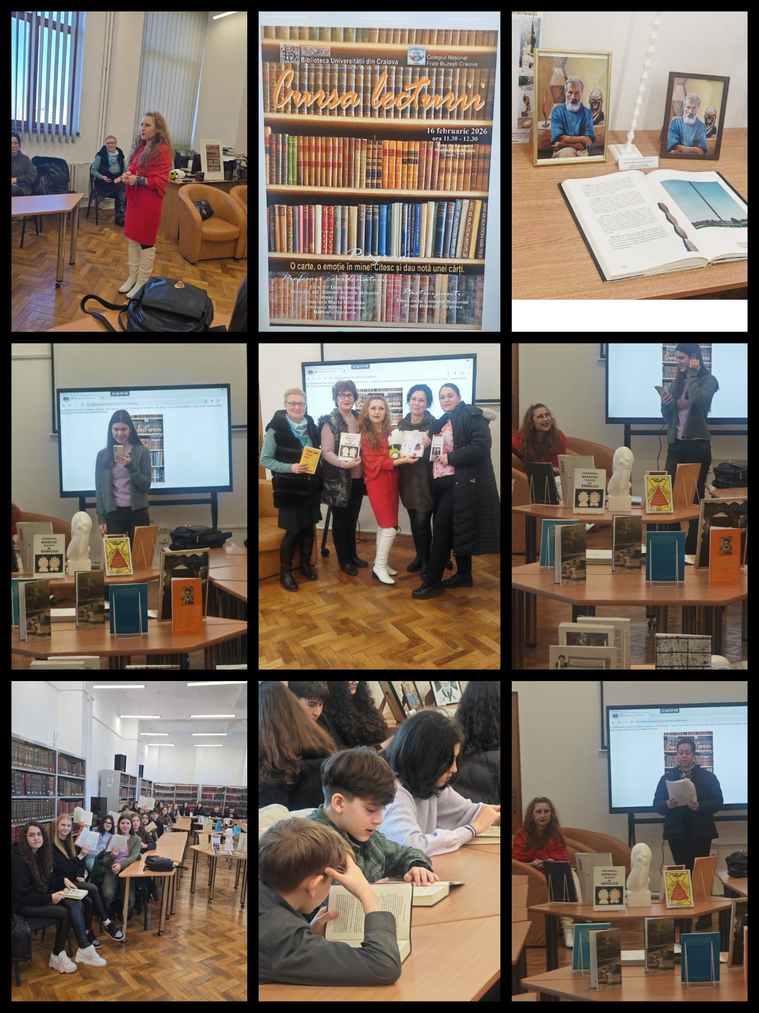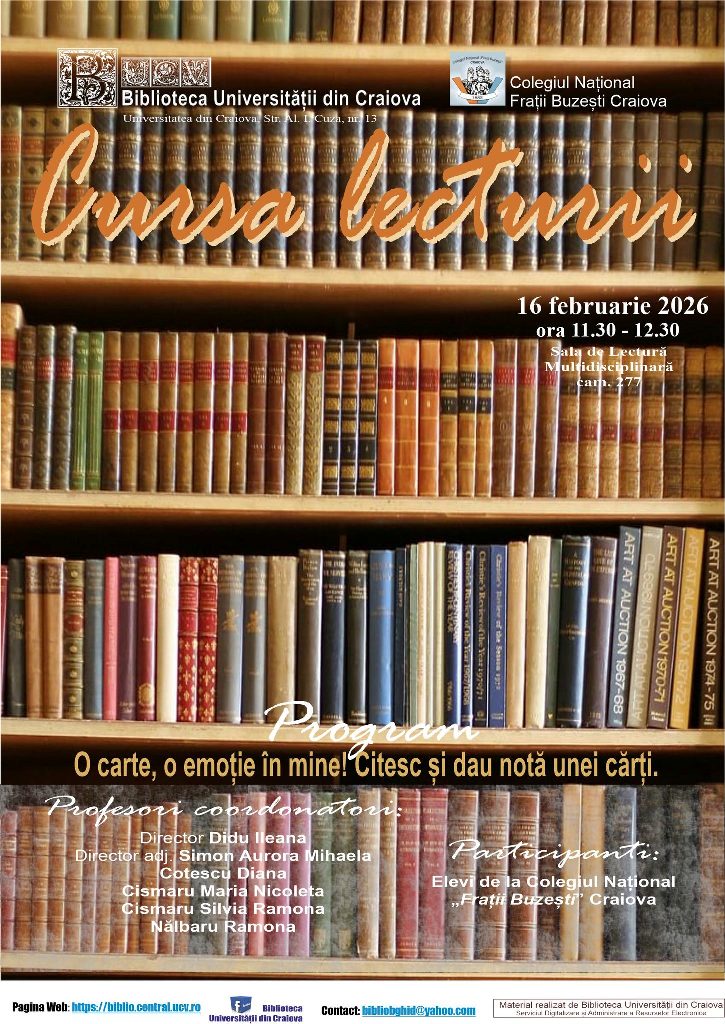 16 februarie 2026 📚𝗖𝘂𝗿𝘀𝗮 𝗟𝗲𝗰𝘁𝘂𝗿𝗶𝗶 – 𝗱𝗲 𝗹𝗮 𝗹𝗲𝗰𝘁𝘂𝗿𝗮 𝗶𝗻 𝗺𝗶𝘀𝗰𝗮𝗿𝗲 𝗹𝗮 𝗹𝗲𝗰𝘁𝘂𝗿𝗮-𝗿𝗲𝗳𝗹𝗲𝗰𝘁𝗶𝗲. Proiect realizat în parteneriat: Colegiul National "Fratii Buzesti", Inspectoratul Școlar Județean DOLJ, Școala Gimnazială „Sfântul Gheorghe”, Şcoala Gimnazială "Eliza Opran" Işalniţa, Liceul Tehnologic „Constantin Ianculescu” Cârcea. Elevi și profesori din Craiova marchează „𝚉𝚒𝚞𝚊 𝙲𝚒𝚝𝚒𝚝𝚞𝚕𝚞𝚒” printr-o activitate inedită: cititul în tramvai (15 februarie, ora 11:00, plecare din stația Universitate Craiova). Elevii oferă cărți cu dedicații, promovând valori precum generozitatea, toleranța, curajul, responsabilitatea și iubirea. Proiectul Cursa Lecturii continuă la Biblioteca Universității din Craiova, unde lectura devine reflecție personală, apreciere critică și dialog. 𝗢 𝗰𝗮𝗿𝘁𝗲, 𝗼 𝗲𝗺𝗼𝘁𝗶𝗲 𝗶𝗻 𝗺𝗶𝗻𝗲! – 𝗖𝗶𝘁𝗲𝘀𝗰 𝘀𝗶 𝗱𝗮𝘂 𝗻𝗼𝘁𝗮 𝘂𝗻𝗲𝗶 𝗰𝗮𝗿𝘁𝗶 📅 16 februarie 2026, 🕚 ora 11:30 📍 Sala de Lectură Multidisciplinară, cam. 277, Clădirea Centrală a Universității din Craiova Cu participarea elevilor Colegiului Național „Frații Buzești” Craiova, coordonați de profesorii: Didu Ileana, Simon Aurora Mihaela, Cotescu Diana, Cismaru Maria Nicoleta, Cismaru Silvia Ramona și Nălbaru Ramona. Evenimentul 🄲🅤🅁🅢🄰 🄻🅔🄲🅣🅄🅡🄸🅘 "văzut" din perspectiva profesorilor coordonatori de la Colegiul Național "Frații Buzești" Craiova 👉 "Cursa Lecturii, azi, 16 februarie 2026, a condus Colegiul National "Fratii Buzesti" , elevi și profesori, la o stație a Cărților, niciodată ultimă, dimpotrivă, mereu, în viață, generoasă, răbdătoare, fascinantă: Biblioteca Universităţii din Craiova. Locul, unde cărțile stau cuminți și tainice pe rafturi, i-a întâmpinat pe elevi și profesori cu atâta bucurie, construind poduri de comunicare între lumile din interiorul autorilor și lumea reală în care trăim toti. Partenerii educaționali : Biblioteca Universității din Craiova-Colegiul National ,, Frații Buzești " au promovat, în inimile elevilor-cititori, în acest fel, o ambianță frumoasă, de tăcută lumină, în suflet și în pagini de carte, sădind ideea că A citi o carte cere o pregătire a Emoției din tine, într-o conectare cu personajele, într-un joc al ideilor, sub ochii admirativi, frumoși ai Bibiotecii Universității din Craiova. Această colaborare între instituții a trezit, în elevi, emoția că a fi într-o sală mare a Bibliotecii Universității din Craiova îi ajută să trăiască sentimentul că pot îndrăzni să se exprime liber, să o exploreze, să o aprecieze, chiar să dea NOTĂ unei Cărți, construind, prin cuvintele lor, departe de Ecrane, o legătură cu Părintele din comunitate. De asemenea, Lectura în sala Bibliotecii Universității din Craiova i-a ajutat pe elevi, prin noul context educational, să-și imagineze că pot fi ,în pagini proprii de jurnal, subiect de Examen Național la disciplina Limba și literatura română, clasa a VIII-a, în orice sală a Bibliotecilor din lume, că pot prinde aripi literele lor la scris, fără inhibare, cu emotie dintr-un eveniment trăit în Ziua Națională a Lecturii. Mulțumim, Biblioteca Universității din Craiova!" Mulțumirile noastre se îndreaptă către toți participanții la eveniment, în special către doamnele prof. Cismaru Maria Nicoleta și prof. Cismaru Silvia Ramona și, nu în ultimul rând, către Tătăroiu Ștefania-Bianca, elevă la Colegiul Național „Spiru Haret” Târgu Jiu, prietenă a comunității noastre literare. 11 februarie 2026 𝐌𝐚𝐠𝐢𝐚 𝐬𝐜𝐮𝐥𝐩𝐭𝐮𝐫𝐢𝐢 𝐛𝐫𝐚𝐧𝐜𝐮𝐬𝐢𝐞𝐧𝐞 Anul acesta se împlinesc 150 de ani de la nașterea unuia dintre cei mai influenți artiști ai secolului al XX-lea, Constantin Brâncuși. Cu această ocazie, profesori și elevi de la Liceul Tehnologic "Constantin Brancusi" Craiova i-au celebrat astăzi, la Sala de lectură multidisciplinară, viața și opera impresionantă, drumul acestuia de la anii de școală din Craiova la consacrarea universală 👉 ▪️„Artistul și vietățile sale”, de dna prof. dr. Maria Tronea, vicepreședinte AMOPA-Roumanie, 11 ans d'existence ▪️„Brâncuși, elev al Școlii de Arte și Meserii din Craiova”, de dna prof. Maria Sîrbu, director Liceul Tehnologic "Constantin Brancusi" ▪️La recitalul plurilingv, „Zborul, ce fericire!”, au participat elevii: Dișcioğullari Nisa, Lohon-Dimon Valentin, Lohon-Dimon Gabriela, Nicolae Andrei, Dana Bianca, Matei Deea, Prioteasa Andreea, Smit Andrei, Ciucă Teodora și Dinculeanu, coordonați de dna prof. Monica Aslan. Evenimentul a fost moderat de colega noastră, bibliotecar dr. Gabriela Voinea. Mulțumim tuturor pentru inițiativă și participare! 15 ianuarie 2026 𝐙𝐢𝐮𝐚 𝐂𝐮𝐥𝐭𝐮𝐫𝐢𝐢 𝐍𝐚𝐭𝐢𝐨𝐧𝐚𝐥𝐞 | 𝐄𝐦𝐢𝐧𝐞𝐬𝐜𝐢𝐚𝐧𝐚 În contextul Zilei Culturii Naționale, am celebrat 1️⃣7️⃣6️⃣ ani de la nașterea poetului Mihai Eminescu, prin alocuțiuni despre actualitatea operei sale, prin recitări emoționante ale poeziilor sale și printr-o expoziție de carte - „𝑀𝑖ℎ𝑎𝑖 𝐸𝑚𝑖𝑛𝑒𝑠𝑐𝑢 𝑖𝑛 𝑐𝑜𝑙𝑒𝑐𝑡𝑖𝑖𝑙𝑒 𝐵𝑖𝑏𝑙𝑖𝑜𝑡𝑒𝑐𝑖𝑖 𝑈𝑛𝑖𝑣𝑒𝑟𝑠𝑖𝑡𝑎𝑡𝑖𝑖 𝑑𝑖𝑛 𝐶𝑟𝑎𝑖𝑜𝑣𝑎”. Sărbătorind moștenirea eminesciană, ne-am reamintit de importanța culturii în definirea identității noastre și în promovarea dialogului și a înțelegerii interculturale. 🔸Au prezentat: dna prof. univ. dr. Elena Pîr